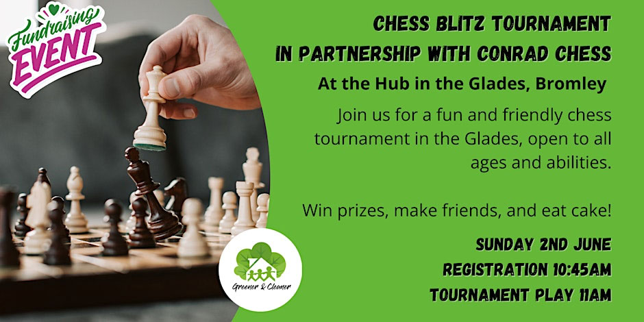 This event is a partnership between Conrad Chess (chess coaching, from our very own Coney Hall resident, Conrad Allison) and Bromley Greener and Cleaner. All proceeds from ticket sales will go towards keeping the much-loved Greener and Cleaner Hub open in the Glades.