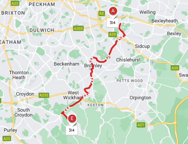 - From the 31 August, the 314 between Eltham and New Addington (via Chislehurst, Bromley, Hayes and Coney Hall) will increase frequency with buses every 20 minutes instead of 30 from early Saturday and Sunday mornings.