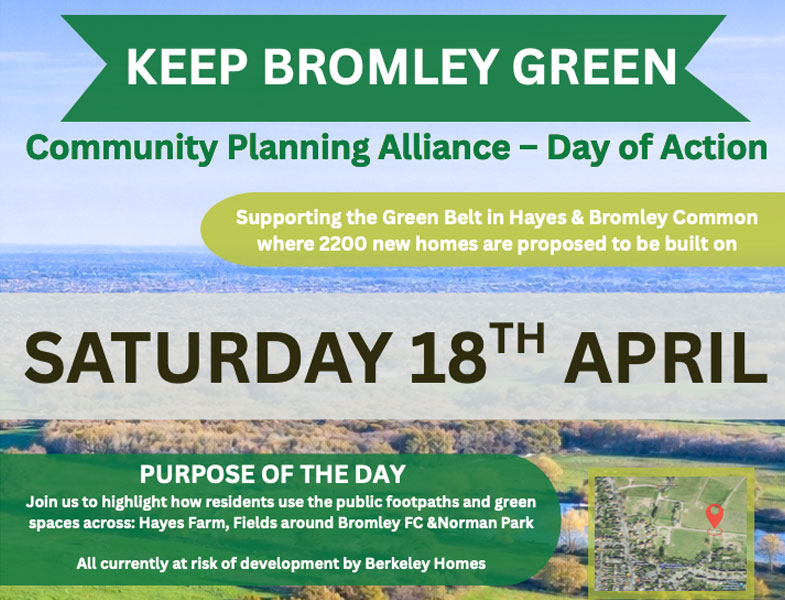 The Community Planning Alliance have paired up with Keep Bromley Green, to organise a day in support of Bromley’s green belt. The plan is to highlight how residents use the public footpaths and green spaces across Hayes Farm, fields around Bromley FC, and Norman Park, all currently at risk of development by Berkeley Homes. If you would like to join the Day of Action, these are the details: